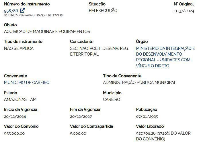 | Convênio 958786 Compra de Retroescavadeira | R$ 927.308,26 |