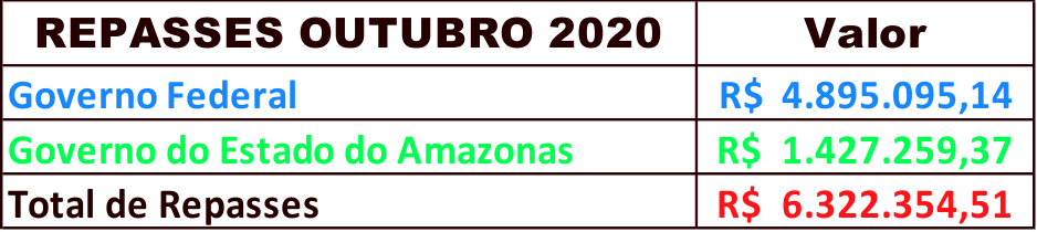 Careiro/AM – No mês de outubro o Governo Federal e o Governo do Estado do Amazonas repassaram ao município do Careiro no período de 01/010 a 31/10 o valor de R$ 6.322.254,51 (Seis milhões, trezentos e vinte e dois mil, duzentos e cinquenta e quatro reais e cinquenta e um centavos) conforme pesquisa realizada hoje (03/10) nos sites do Banco do Brasil e da Secretaria da Fazenda do Estado do Amazonas (SEFAZ-AM), confira a seguir os recursos recebidos: