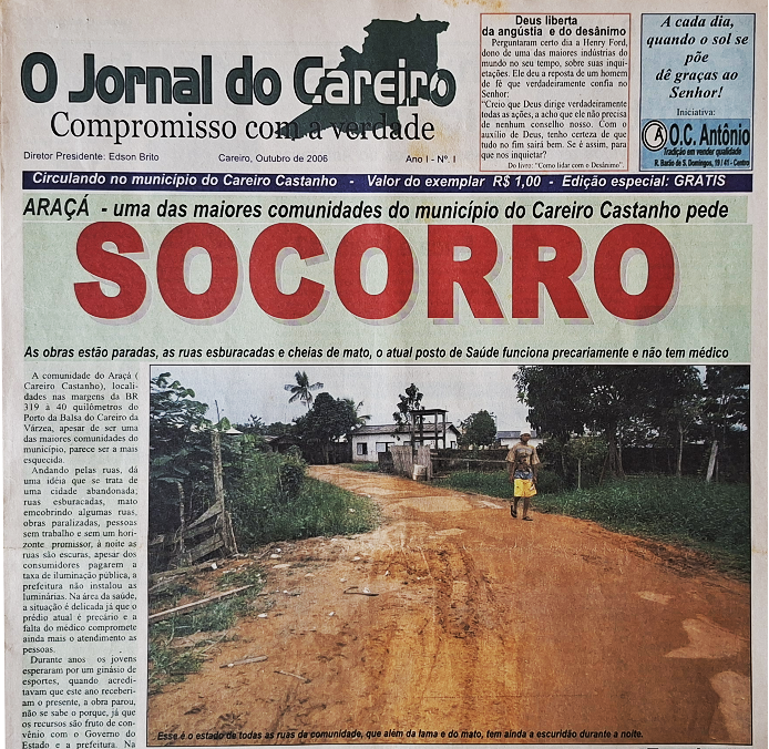 A manchete de estreia do Jornal do Careiro foi “SOCORRO”, mostrando um pouco da realidade das ruas do Distrito do Araçá — uma realidade que, infelizmente, ainda permanece com poucos avanços, mesmo após quase duas décadas.