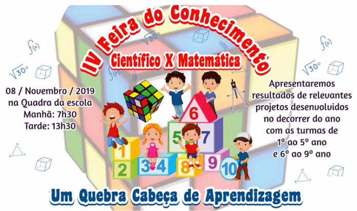 Careiro/AM – A Escola Municipal Daniel Conrado localizada no município do Careiro-AM realizará no próximo dia 08 de novembro a IV Feira do Conhecimento Científico X Matemática – Um Quebra Cabeça de Aprendizagem, na oportunidade será apresentado resultados de relevantes projetos desenvolvidos no decorrer do ano com as turmas de 1º ao 5º ano e do 6º ao 9º ano.