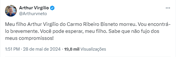 Confirmação – A morte de Arthur Bisneto foi confirmada pleo pai Arthur Vigílio em uma publicação na Rede X.