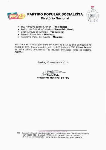 A Executiva Nacional do PPS-23 – Partido Popular Socialista, dissolveu o Diretório do PPS no Amazonas e nomeou uma nova Direção Provisória, veja o documento a seguir: