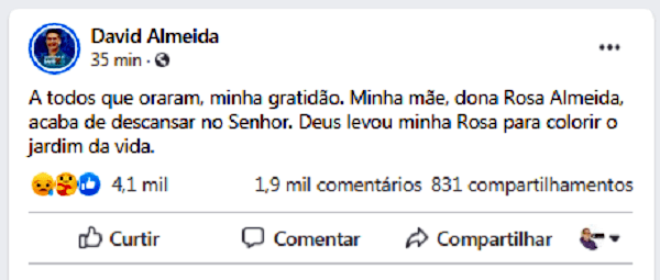 Manaus/AM – O candidato à Prefeitura de Manaus pelo partido Avante, David Almeida, comunicou na tarde deste sábado o falecimento de sua mãe. Ela havia passado por um agravamento de seu quadro de saúde nesta sexta-feira (28), o que chegou a provocar o cancelamento da participação do candidato de um debate programado para a noite de ontem (27).