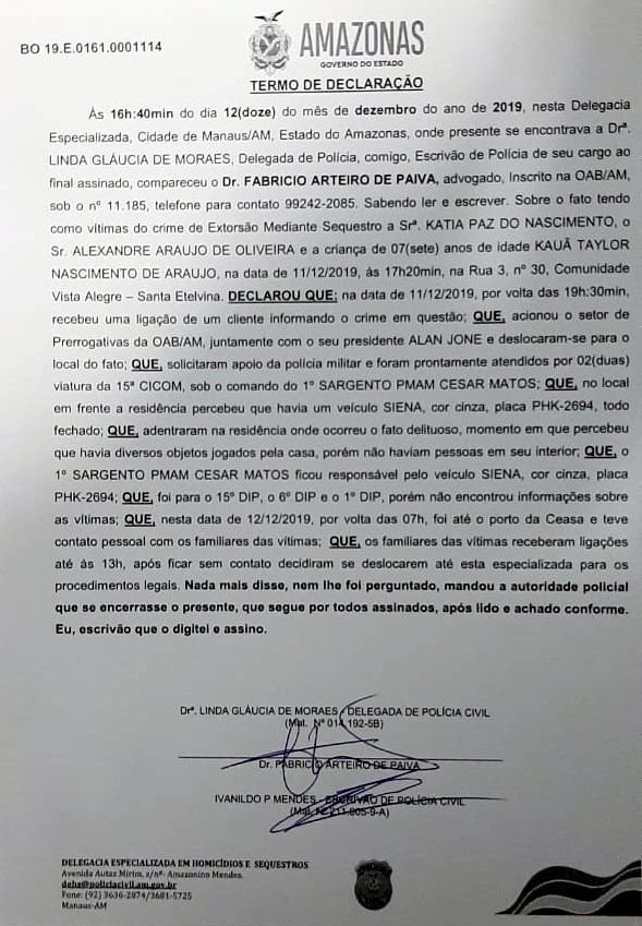 Manaus/AM – Conforme Boletim de Ocorrência registrado pelo advogado Dr. Fabricio Arteiro de Paiva o pai, a mãe e um menor da mesma família foram vítimas de extorsão mediante sequestro são eles: Katia Paz do Nascimento, André Araujo de Oliveira e o meno Kauâ Taylor Nascimento de Araujo de sete anos.