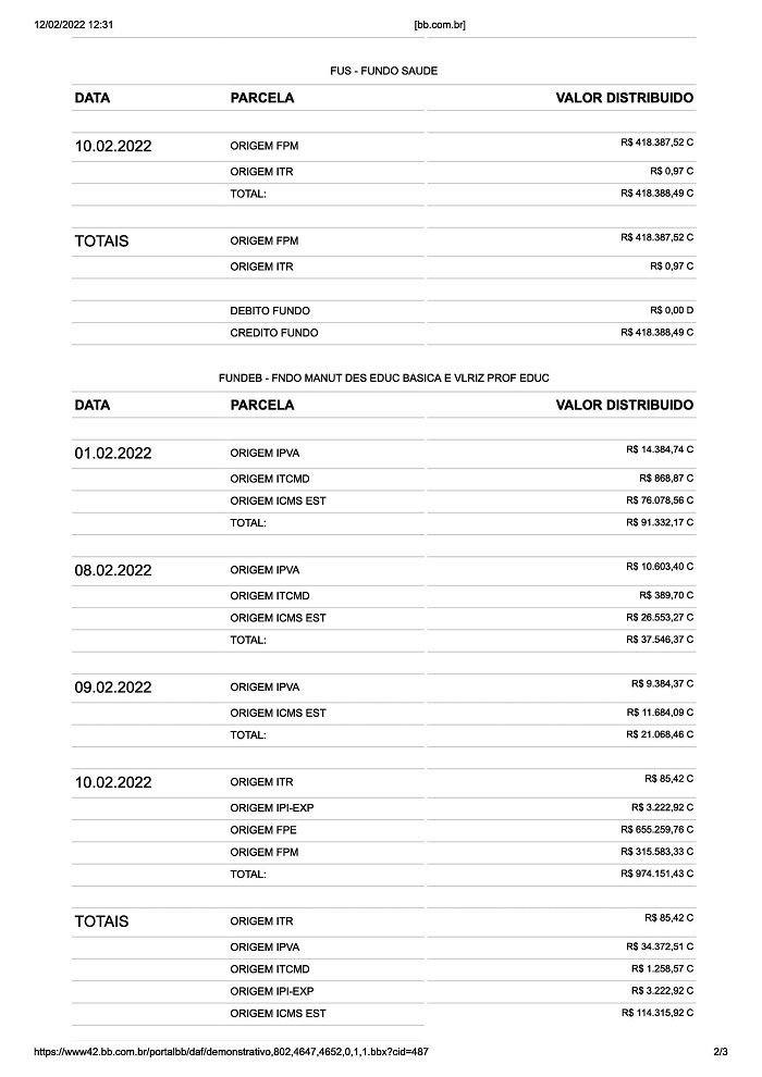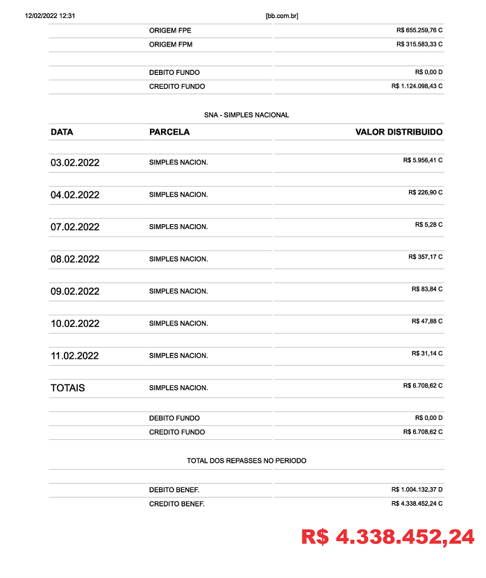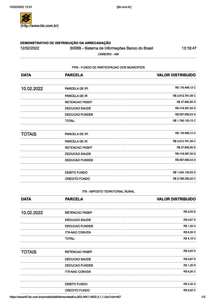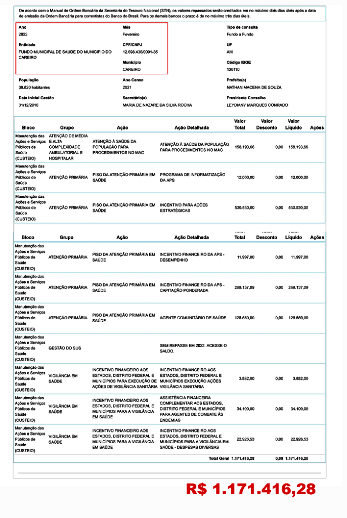 Careiro/AM – Conforme publicação no site do Banco do Brasil o município do Careiro no Amazonas recebeu no fevereiro do Governo Federal e do Fundo Nacional de Saúde o valor bruto de R$ 5.509.881,76 (Cinco milhões, quinhentos e nove mil, oitocentos e oitenta e um reais e setenta e seis centavos), Veja a seguir: