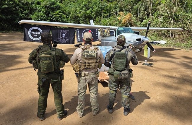 Manaus/AM. A Força Integrada de Combate ao Crime Organizado do Amazonas (FICCO/AM), em ação integrada com o Grupo Especial de Segurança de Fronteira (Gefron/MT), com o Centro Integrado de Operações Aéreas (Ciopaer/MT), com a Polícia Militar de Mato Grosso, com a Companhia de Operações Especiais (COE/PMAM) e com a Força Aérea Brasileira (FAB), realizou, nesta terça-feira (27/1), uma operação de combate ao tráfico de drogas, no município de Maués/AM. Durante a ação, foram apreendidos aproximadamente 500kg de cloridrato de cocaína e duas armas de fogo.