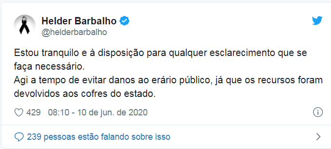 “Estou tranquilo e à disposição para qualquer esclarecimento que se faça necessário”, escreveu Barbalho. “Agi a tempo de evitar danos ao erário público, já que os recursos foram devolvidos aos cofres do estado”, acrescentou.