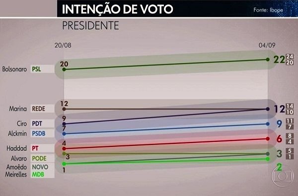 Pesquisa anterior – Na pesquisa anterior, divulgada no dia 20 de agosto, Jair Bolsonaro (PSL) tinha 18%. Marina Silva, candidata da Rede, 6% das intenções; Ciro Gomes (PDT) e Geraldo Alckmin (PSDB), com 5% cada um; Alvaro Dias (Podemos), 3%. Com 1% das intenções dos votos, apareciam Guilherme Boulos (PSOL), Henrique Meirelles (MDB), João Amoêdo (Novo) e José Maria Eymael (DC). Os candidatos Cabo Daciolo (Patriota), Vera Lúcia (PSTU) e João Goulart Filho (PPL) não atingiram 1%.