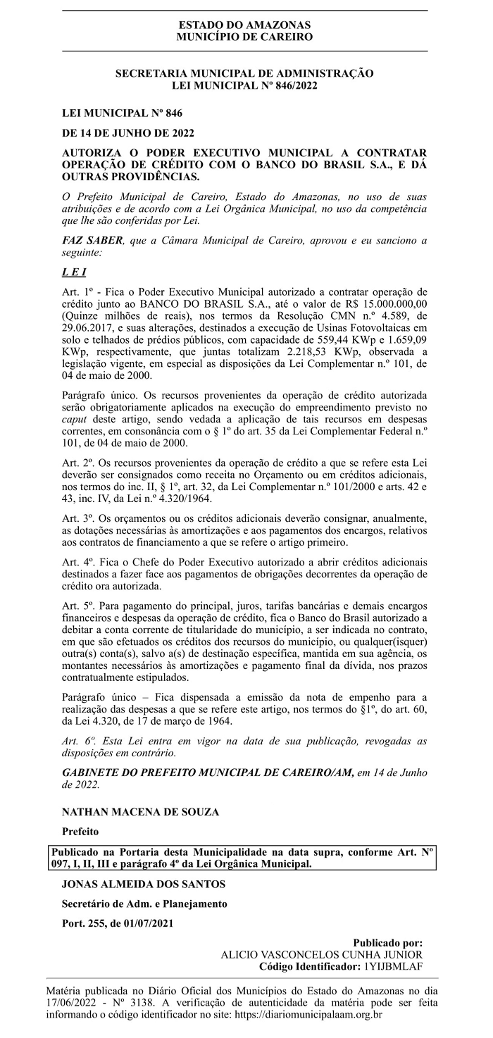 Careiro/AM – A maioria dos vereadores da Câmara Municipal do Careiro no Amazonas, formada pela base do prefeito Nathan Macena aprovou e o prefeito sancionou a Lei Nº 846 de 14 de junho de 2022 que autoriza o Poder Executivo Municipal a contratar operação de crédito (empréstimo) junto ao BANCO DO BRASIL S.A., até o valor de R$ 15.000.000,00 (Quinze milhões de reais).
