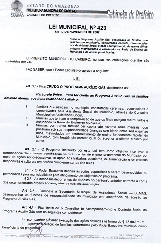 A Lei N° 423 de 13 de Novembro de 2007, Criou o Programa Auxílio Gás a famílias carentes do município, para ter acesso ao auxilio gás as famílias têm que preencher alguns requisitos constantes na Lei entre eles: residir no município, serem reconhecidamente carentes por Assistência Social, comprovar que os filhos estão matriculados e estudando na Rede de Ensino do Município, para saber quem tem ou não direito ao auxílio gás publicamos a baixo a Lei.