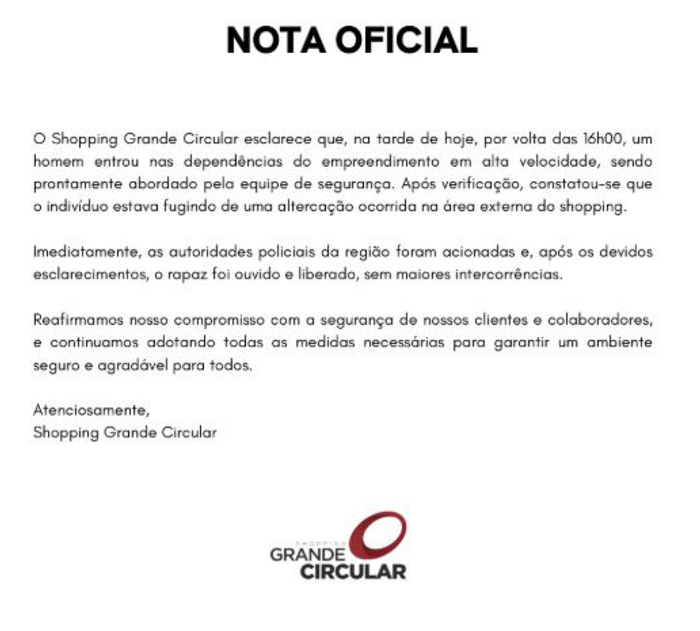 Manaus/AM – O Shopping Grande Circular emitiu uma nota oficial sobre o vídeo divulgado nas redes sociais, no qual é relatado um assalto ocorrido no final da tarde de ontem (18/12), dentro de suas dependências. Confira a nota a seguir: