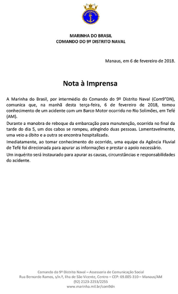 A Marinha do Brasil, por intermédio do Comando do 9º Distrito Naval (Com9°DN), comunica que, na manhã desta terça-feira, 6 de fevereiro de 2018, tomou conhecimento de um acidente com um Barco Motor ocorrido no Rio Solimões, em Tefé (AM).