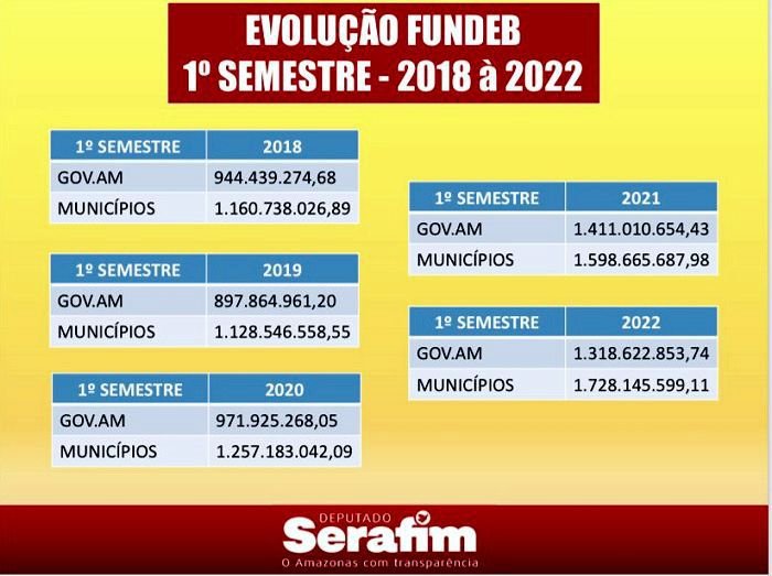 O parlamentar chegou a divulgar números do Fundeb dos últimos cinco anos. Em 2018, o governo do Amazonas tinha em caixa R$ 944,4 milhões; em 2019, R$ 897,8 milhões; em 2020, R$ 971,9 milhões; em 2021, R$ 1,4 bilhões e em R$ 2022, R$ 1,3 bilhões. Em comparação com 2018, há um aumento de R$ 374, 1 milhões em 2022 dos recursos do Fundeb do governo do Estado, o que implica em um aumento de 39,61%.