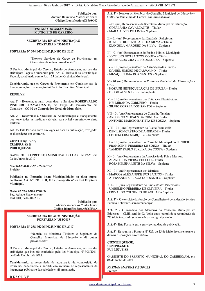 Hoje (07) foi publicado no Diário Oficial do Município A PORTARIA Nº 358 DE 06 DE JUNHO, com a nomeação dos membros titulares e suplentes do Conselho Municipal de Educação do Município, a Lei Municipal Nº 505/2011, de 03 de Outubro de 2011 é a base legal para as nomeações. No Art 5° da referida Lei diz quais são as entidades com representantes no Conselho Municipal de Educação – CME conforme a seguir: