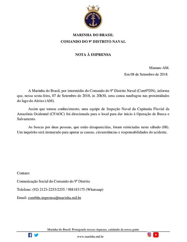Manaus/Am – A seguir publicamos a Nota do Comando do 9 Distrito Naval sobre o naufrágio de uma canoa nas proximidades do lado do Aleixo em manaus.