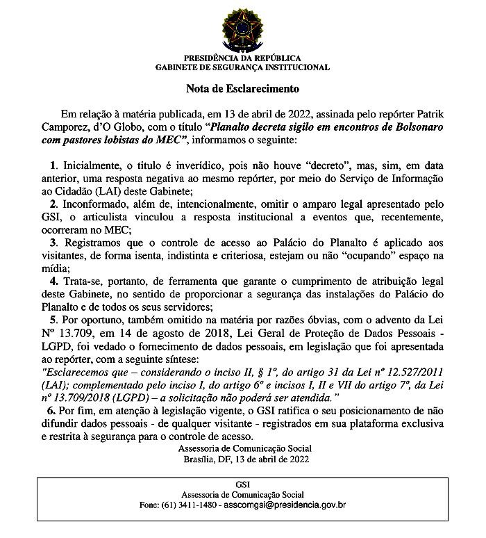 Camporez, d’O Globo, com o título “Planalto decreta sigilo em encontros de Bolsonaro