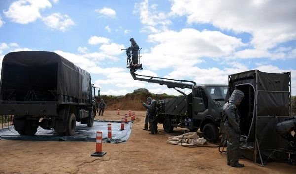 Em outra Linha Física, o armamento era colocado em uma tenda com água a 180°C, temperatura segura para eliminar a ameaça. Após todo material e tropa serem descontaminados, é a vez de os militares do 1° Btl DQBRN passarem pelo banho descontaminante em uma quarta Linha.