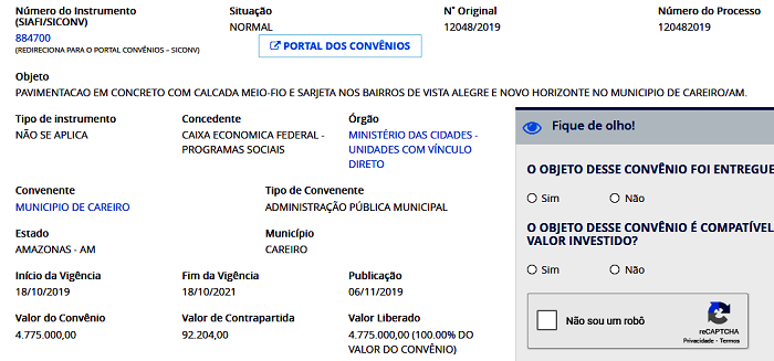 Careiro/AM – O município do Careiro no Amazonas recebeu o valor de R$ 4.775.000,00 (Quatro milhões, setecentos e setenta e cinco mil reais). Referente ao Convênio 884700 destinado a Pavimentação em concreto de 19 ruas com: Calçada, Meio-Fio e Sarjetas nos Bairros Vista Alegre e Novo Horizonte.