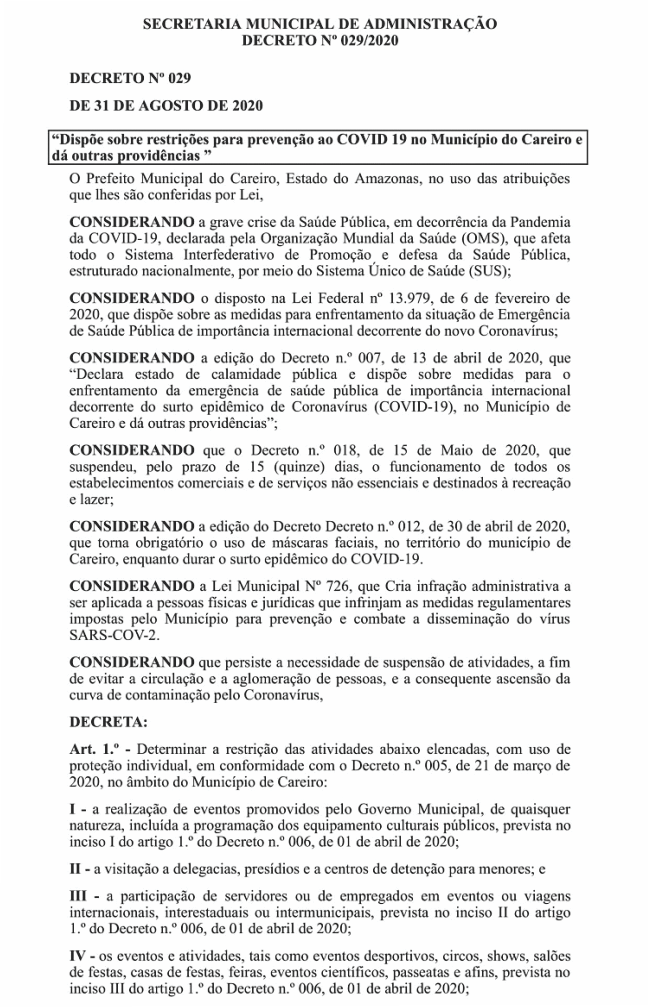 Careiro/AM – Enquanto o Brasil volta a normalidade o Prefeito do Careiro Nathan Macena assinou um Decreto que restringe o acesso de pessoas e atividade comerciais no município, veja o Decreto Nº 029/2020 na íntegra publicado no Diário Oficial dos Municípios de hoje (01/09) a seguir: