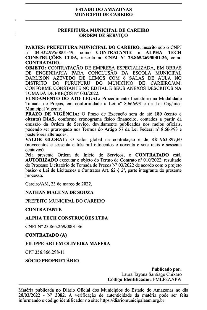 Careiro/AM – Foi publico no Diário Oficial dos Municípios do Estado do Amazonas de hoje (28) Ordem de Serviço para a conclusão da Escola Municipal Darlison Azevedo de Lemos no Distrito do Purupuru Município de Careiro no Amazonas, conforme Constante no Edital e seus anexos descritos na Tomada De Preços Nº 003/2022 no valor global de R$ 963.897,60 (novecentos e sessenta e três mil oitocentos e noventa e sete reais e sessenta centavos). Conforme a seguir:
