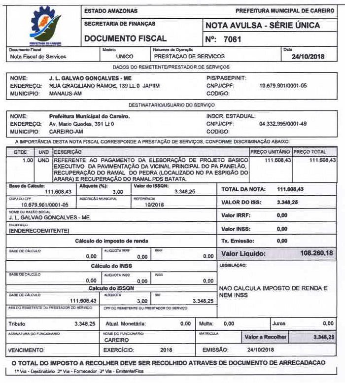 Outubro de 2018, a Prefeitura do Careiro pagou à empresa J. L. Galvão Gonçalves – ME o valor de R$ 111.608,00 (Cento e onze mil, seiscentos e oito reais). Conforme Nota Fiscal a baixo: