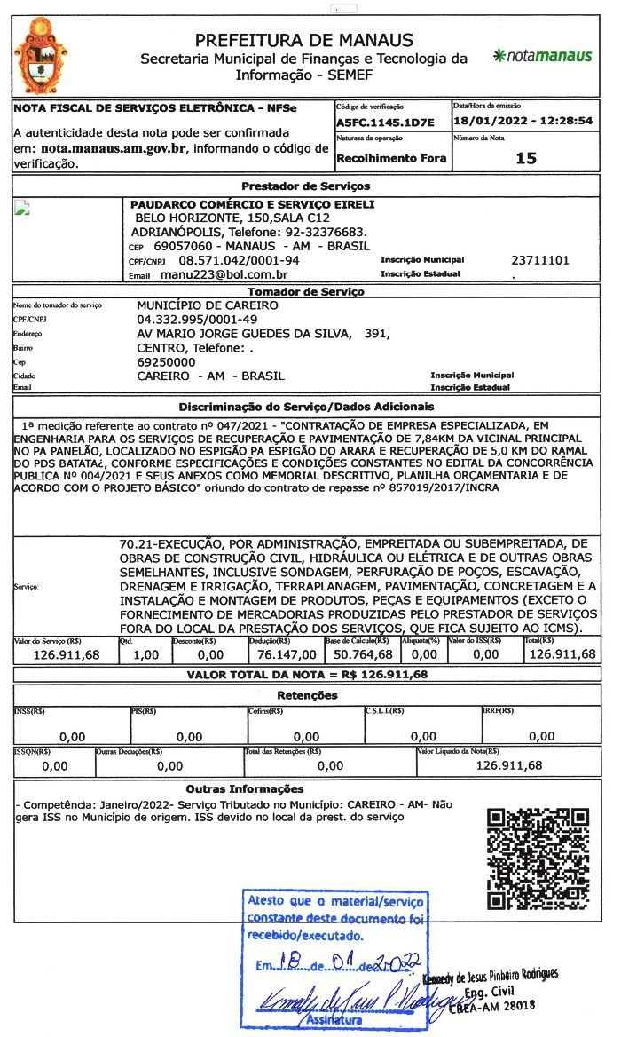 Janeiro de 2022, a Prefeitura do Careiro pagou à Construtora Paudarco o valor de R$ 126.911,00 (Cento e vinte e seis mil, novecentos e onze reais). Referente a serviços executados no Ramal do PÁ Panelão e Ramal do Batata. Nota Fiscal a baixo: