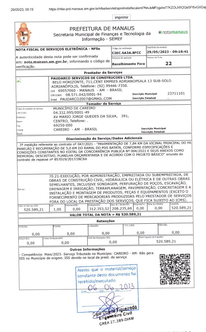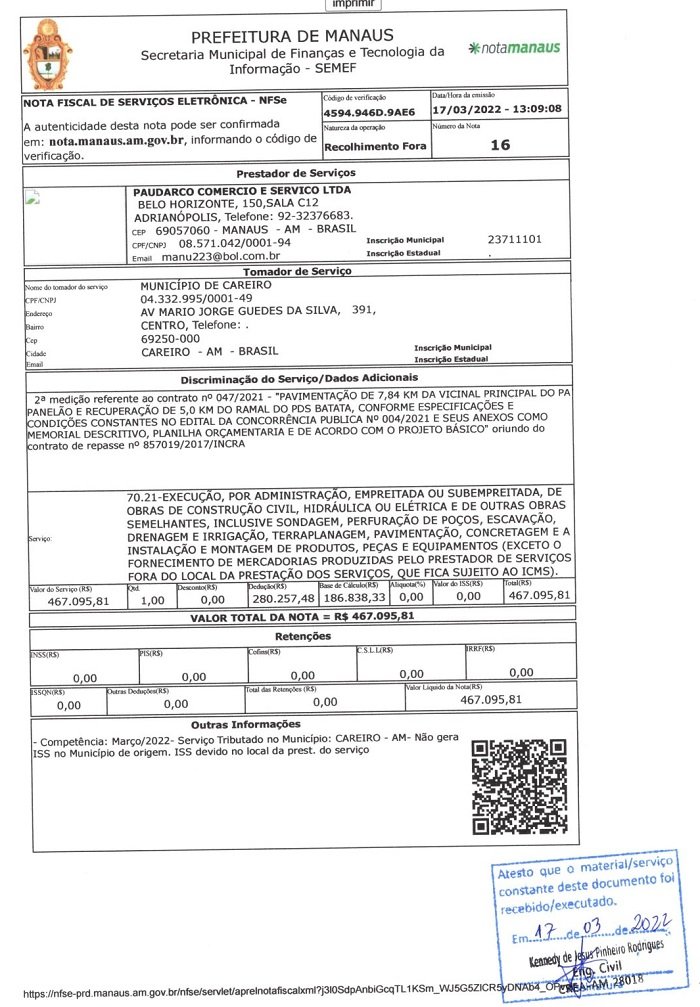 Março de 2022, a Prefeitura do Careiro pagou á Construtora Paudarco o valor de R$ 467.095,00 (Quatrocentos e sessenta e sete mil e noventa e cinco reais). Referente a serviço serviços executados no Ramal do PÁ Panelão e Ramal do Batata. Conforme Nota Fiscal a baixo: