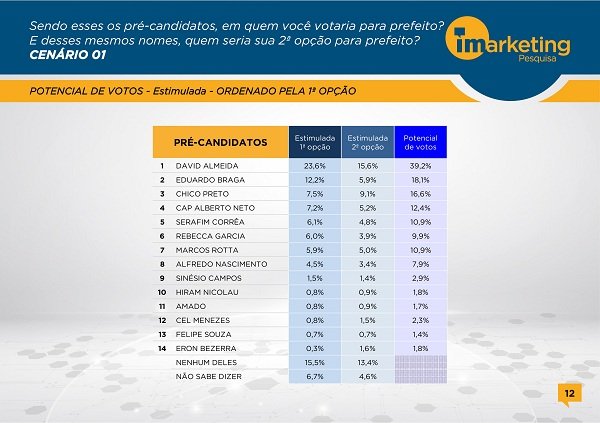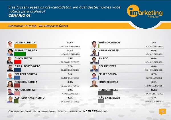 Manaus-AM – Na ultima pesquisa do ano da Imarketing David Almeida segue firme na liderança rumo a Prefeitura de Manaus, veja seguir: