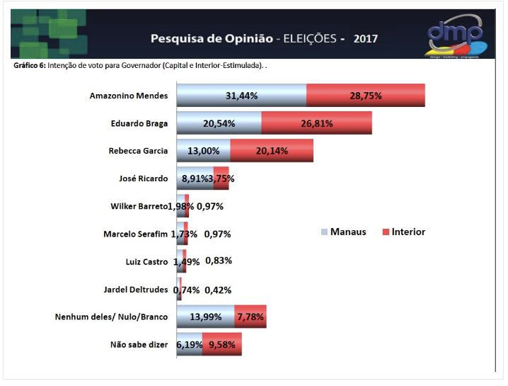 Comparativamente com a pesquisa realizada entre os dias 21 e 25 de junho, as posições entre os ex-governadores Eduardo Braga (PMDB) e Amazonino Mendes (PDT), se inverteram. Amazonino cresceu, Eduardo caiu. Quem também cresceu foi a ex-deputada federal Rebecca Garcia (PP).