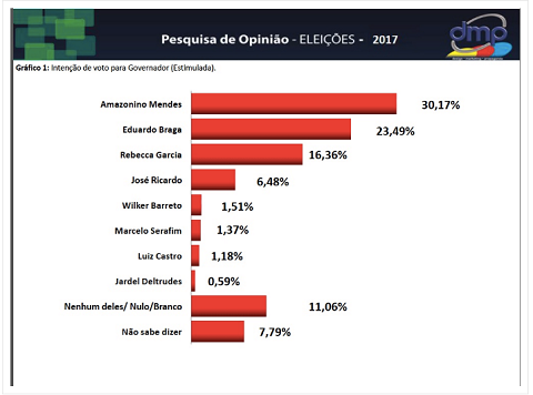 Comparativamente com a pesquisa realizada entre os dias 21 e 25 de junho, as posições entre os ex-governadores Eduardo Braga (PMDB) e Amazonino Mendes (PDT), se inverteram. Amazonino cresceu, Eduardo caiu. Quem também cresceu foi a ex-deputada federal Rebecca Garcia (PP).
