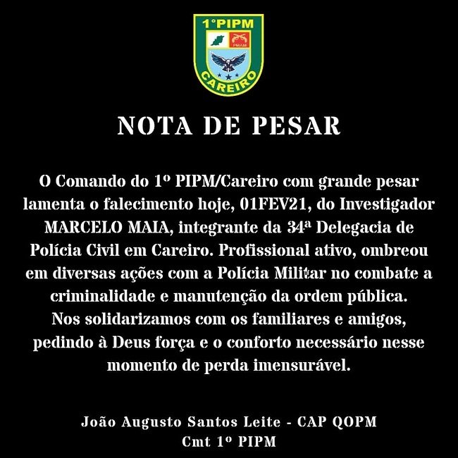 Careiro/AM – O 1º PIMP-Careiro através do seu comandante o CAP QOPM Augusto Leite emitiu NOTA pelo falecimento do Policial Civil Investigador Marcelo Maia vítima de complicações do Covid-19, ele era lotado no 34º Careiro, veja a nota a seguir: