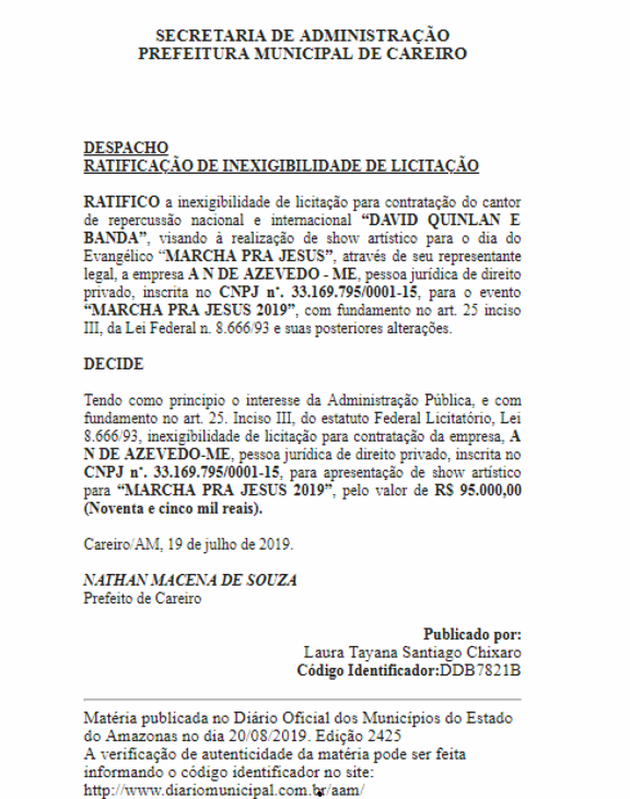 O último evento “Marcha Para Jesus 2019” a atração nacional “DAVID QUINLAN E BANDA” custou aos cofres do município R$ 95.000,00 (Noventa e cinco mil reais) conforme publicado no Diário Oficial dos Municípios do Estado do Amazonas no dia 20/08/2019 na edição 2425, conforme reprodução a seguir: