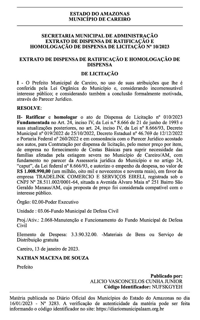 Careiro/AM – A prefeitura municipal do Careiro no Amazonas está contratando por Dispensa de Licitação uma empresa de Manaus para fornecer cestas básicas, segundo a DISPENSA DE LICITAÇÃO Nº 10/2023 o valor da compra passa de um milhão de reais, veja a seguir: