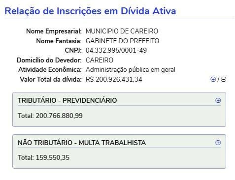 Consulta pública — Ontem 22 de outubro, conforme consulta pública realizada — acessível a qualquer cidadão do país — apontou que o município do Careiro acumula dívida superior a R$ 200 milhões inscrita na Dívida Ativa da União. O levantamento também identificou uma multa trabalhista no valor de R$ 159 mil, conforme os dados oficiais apresentados abaixo.