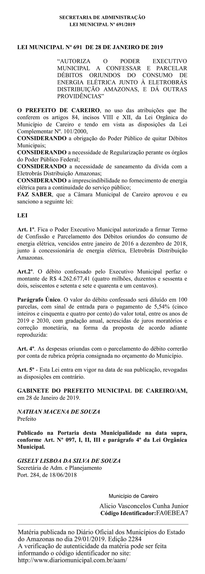 Fato comprovado — A Lei Municipal nº 691, de 28 de janeiro de 2019, aprovada pela Câmara Municipal do Careiro, autorizou o parcelamento, em 100 prestações mensais, de débitos de energia elétrica junto a concessionária referentes ao período de janeiro de 2016 a dezembro de 2018.