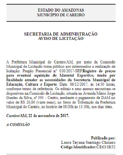 Conforme edital abaixo a Prefeitura do Careiro realizará licitação para a compra de materiais esportivos veja no Edital a baixo: