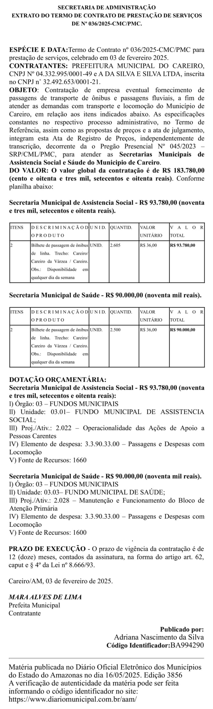 Fonte: Diário Oficial Eletrônico dos Municípios do Estado do Amazonas no dia 16/05/2025. Edição 3856 – Código Identificador:BA994290