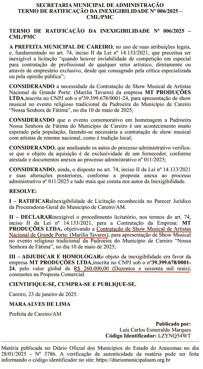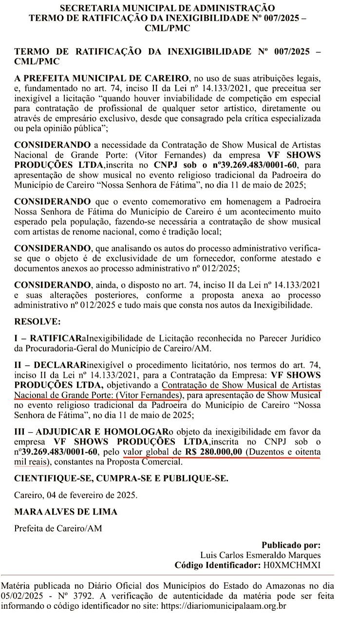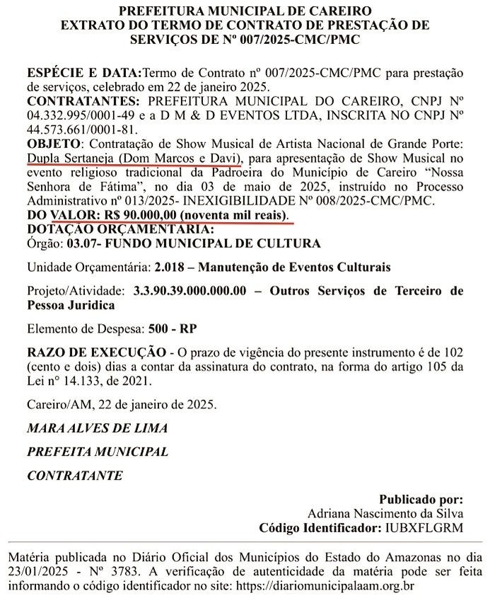 Careiro/AM – A Prefeitura Municipal do Careiro, no Amazonas, vai gastar R$ 630.000,00 (seiscentos e trinta mil reais) dos cofres públicos para a contratação de três atrações nacionais para a Festa da Padroeira “Nossa Senhora de Fátima” deste ano. Diante desse gasto, surge a dúvida: será que está sobrando dinheiro ou está faltando prioridades na gestão municipal? Confira os detalhes das contratações a seguir: