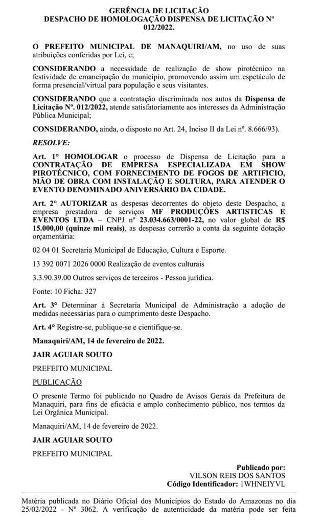 Manaquiri/AM – Foi publicado no Diário Oficial dos Municípios do Estado do Amazonas de hoje (25) o Despacho de Homologação Dispensa de Licitação, no qual a Prefeitura Municipal do Manaquiri no Amazonas vai pagar para empresa MF PRODUÇÕES ARTISTICAS E EVENTOS LTDA o valor de R$ 15.000,00 (Quinze mil reais) para: O “fornecimento de fogos de artificio, mão de obra com instalação e soltura, para atender o evento denominado aniversário da cidade”.