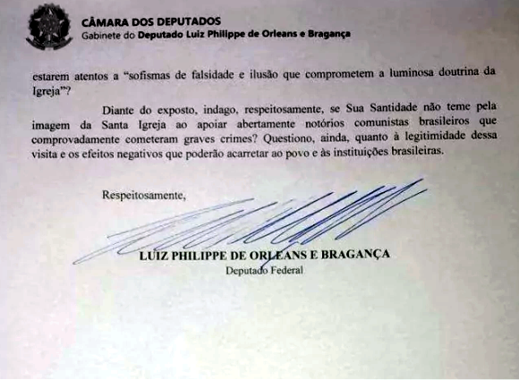 Em carta enviada ao arcebispo Giovanni D’Aniello, o deputado federal Luiz Phillippe de Orleans e Bragança comenta – e nem seria necessário – o estapafúrdio convite do papa Bergoglio feito ao condenado Luiz Inácio Lula da Silva, ocasionalmente em liberdade.
