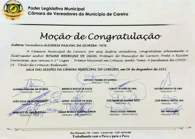 Careiro/AM – A Câmara Municipal de Careiro – AM, concede ao Poeta, Escritor e Prof. Hosane Henrique Lucas de Souza: Moção de Congratulação. A Honraria é pelo feito literário do artista ter vencido em 1° Lugar o Concurso Nacional em Crônica – 2021. Realizado pela ALAPG – Academia de Letras e Artes de Praia Grande – SP. Tema: Pandemia. Título da Crônica: Redenção.