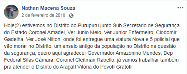 Careiro-AM – O prefeito do município esteve no Distrito do Purupuru no dia 02 de fevereiro de 2018 com uma grande comitiva de vereadores e autoridades no Purupuru, na oportunidade ele se reuniu com a população e fez duas promessas, a primeira de entregando uma viatura nova e a outra que 05 policias iam morar no Purupuru, mas infelizmente passados mais de dois anos lamentavelmente as promessas não foram cumpridas e a população do Purupuru clama até hoje por segurança, a esperança é que as promessas sem cumpridas pois estamos em ano eleitoral.