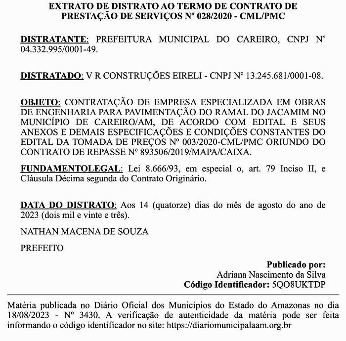 Fim do Contrato – Hoje 18/08/2023 através de um Distrato chegou ao fim o contrato entre a Prefeitura Municipal do Careiro e a Construtora V R CONSTRUÇÕES EIRELI – CNPJ Nº 13.245.681/0001-08 para a pavimentação Asfáltica do Ramal do Jacamim no Município do Careiro/AM, o Distrato do contrato foi publicado no Diário Oficial dos Municípios do Amazonas.