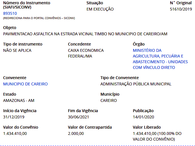 Careiro/AM – No dia 14/01/2021 foi liberado o valor R$ 1.434.410,00 (Hum milhão, quatrocentos e trinta e quatro mil, quatrocentos e dez reais) referente ao valor total do valor do convênio para asfaltamento do Ramal do Timbó no município do Careiro/Amazonas.