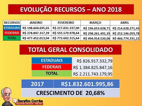 Somente no primeiro quadrimestre deste ano, os municípios do Amazonas receberam, por meio de repasses da União e do governo estadual, R$ 2,2 bilhões em repasses. A informação foi divulgada pelo deputado Serafim Corrêa (PSB), em discurso nesta quarta-feira (16) na Assembleia Legislativo do Estado (ALE-AM).