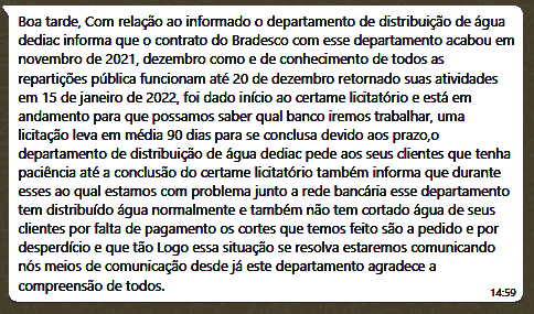 Careiro/AM – Sobre a matéria publicada no Portal com o titulo “Careiro/AM: Moradores afirmam que “bancos não estão recebendo a conta de água”. Disponibilizamos espaço no Portal do Careiro para resposta da Dediac à população e o Sr. Antônio enviou via Whatsapp os seguintes esclarecimentos: