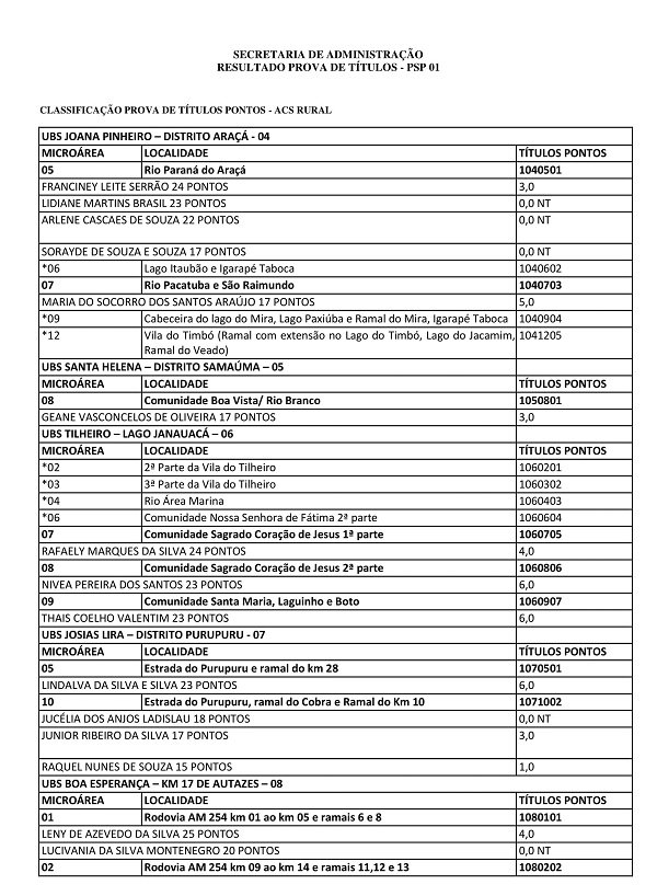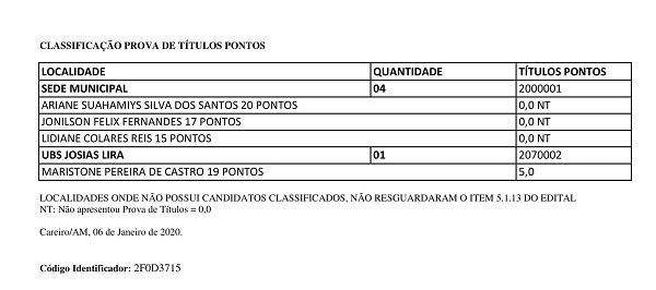 Careiro/AM – Foi publicado no Diário Oficial dos Municípios do Amazonas hoje (08) o Resultado da Prova de Títulos Pontos – PSP 01 conforme reproduzimos a seguir: