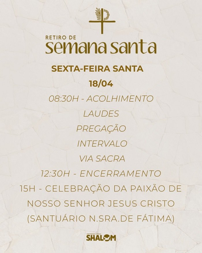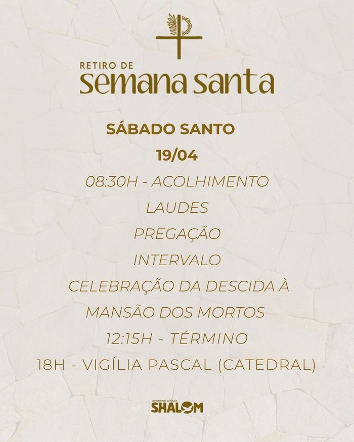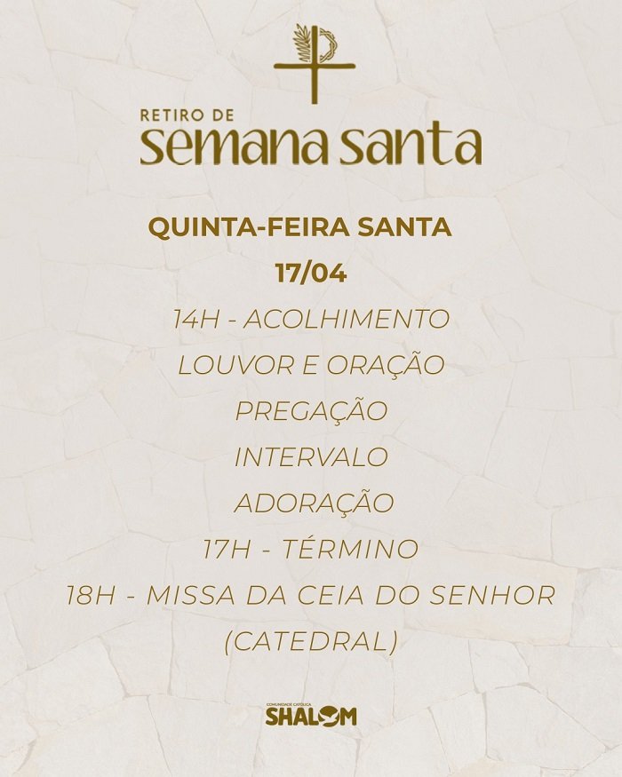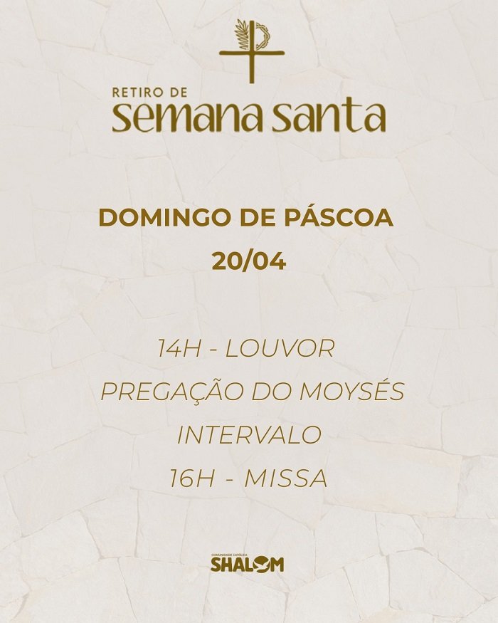 Manaus/AM – De 17 a 20 de abril a Comunidade Católica Shalom vai realizar o Retiro de Semana Santa, no Centro de Convivência Magdalena Arce Daou
