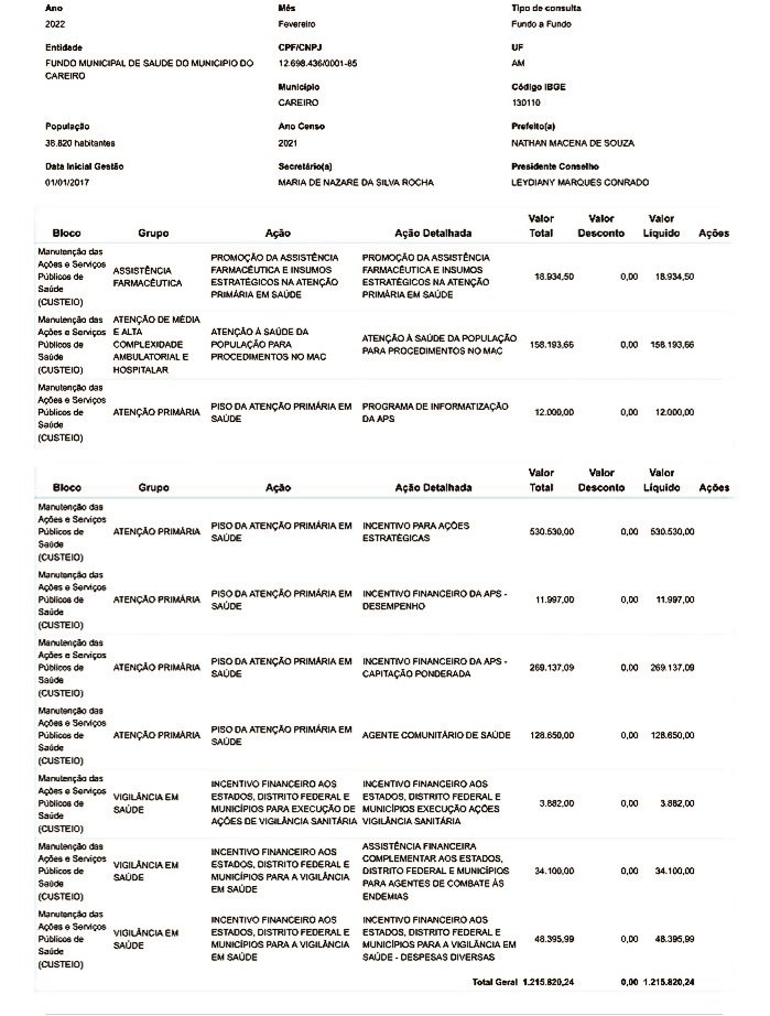 Careiro/AM – No mês de fevereiro o município do Careiro no Amazonas recebeu recursos para a saúde que somados chegam a R$ 1.775.887,45 (Hum milhão, setecentos e setenta e cinco mil, oitocentos e oitenta e sete reais e quarenta e cinco centavos). Conforme pesquisa nos site do Bando do Brasil e no site da Fundação Nacional de Saúde, conforme a seguir: