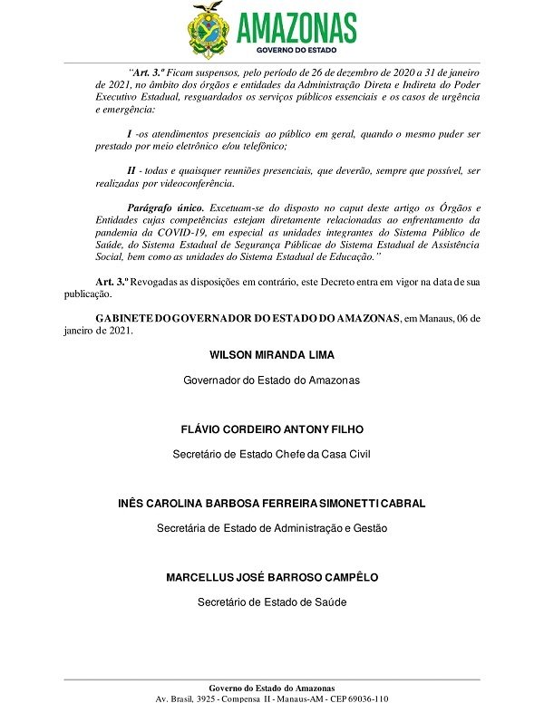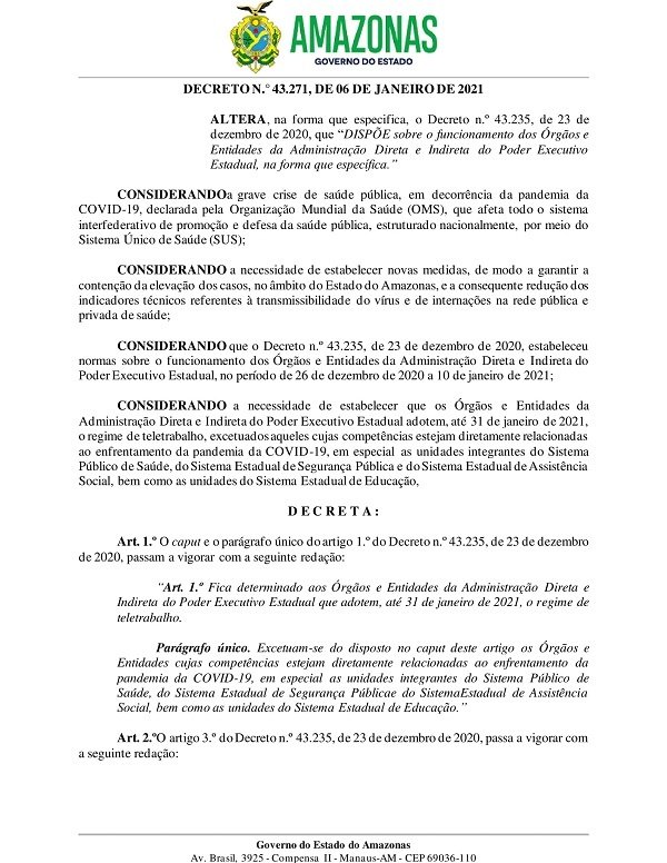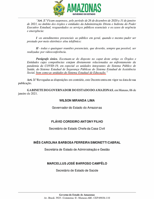 Manaus-AM – Só pode ser um engano, o DECRETO N.° 43.271 do Governo do Estado do Amazonas, publicado hoje (06/01) que trata do funcionamento dos Órgãos e Entidades da Administração Direta e Indireta do Poder Executivo Estadual mantém em funcionamento as unidades do Sistema Estadual de Educação.